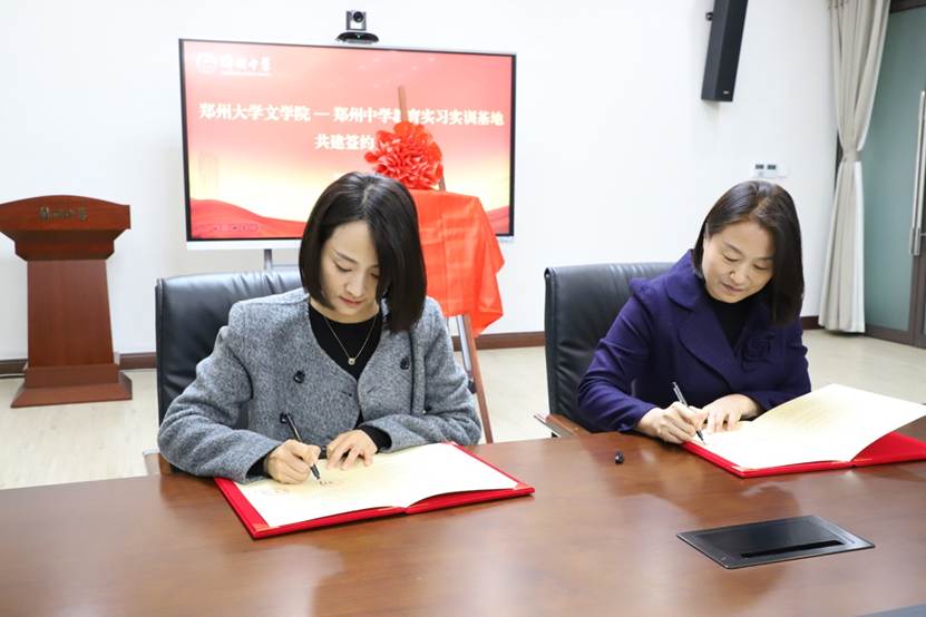 12月22日,文学院党委书记云桓、副院长张力、党政办公室主任苏雨、实习实训中心主任王志军等一行前往郑州中学交流,双方共同举行实习实践基地签约暨揭牌仪式。郑州中学党委书记李兰、校长李松涛及相关负责人参加。