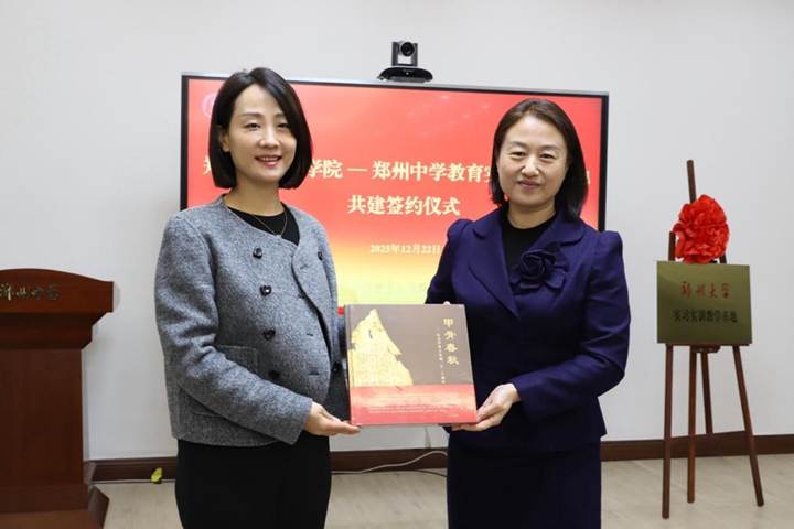 云桓介绍了文学院的基本概况以及在人才培养、实习实践等方面取得的成果。她表示,此次交流旨在推动双方合作更深层次、更实层面迈进,通过协同育人机制,为学生开拓更为广阔的就业发展空间。她希望双方共同探索协同育人新路径,欢迎郑州中学学子走进学院的“中华汉字文化园”实践平台,同时文学院学生也将深入中学课堂传播中原文化。她强调,共建实习实践基地,不仅是双方践行“立德树人”根本任务的具体行动,更是贯彻落实党的二十届四中全会精神、切实提升人才培养质量的重要举措。今后,期待双方能在项目共建、学术交流、人才培养等方面持续协同,将实习实践基地打造为校际合作的典范,助力人才培养高质量发展。
