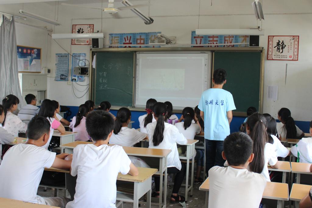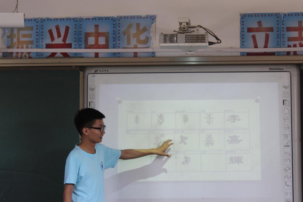 “李嘉辉大哥哥上课的时候给我们讲了很多好玩的小故事,我们都喜欢听他的课。”文字学是一门深奥的课程,其中牵涉到了大学语文知识,也是我们文学院的特色课程。但李嘉辉老师却能用自己的魔法,化晦涩难懂为通俗平易。“会意者,比类合宜,以见指为,武信是也。会意字的意思就是,把两个或者多个字和在一起,组成一个新字,表达新的意思。比如这个‘信’字,由单人旁和一个‘言’字组成。人、言为信,这也告诉我们,做人应该言出必信,诚实守信。”短短的几句话,既简单明了地阐释了“会意字”的概念,又教给孩子们做人的道理。为了更好地让同学们明白什么是甲骨文,李嘉辉老师在课堂中穿插了提前备好的动画视频和歌曲,加上他幽默风趣的讲课风格,原本枯燥古板的文字学也变得妙趣横生。夏日午后沉闷的教室,也因孩子们清澈的笑声而清爽起来。课后,李嘉辉老师顾不上换下被汗水浸湿的衣服,走到同学们中间,亲切地询问他们对于上节课的感受及建议。正如李嘉辉老师所说,“孩子们对知识的真正理解与掌握,是对我们老师辛苦备课的最大安慰与鼓励。”
