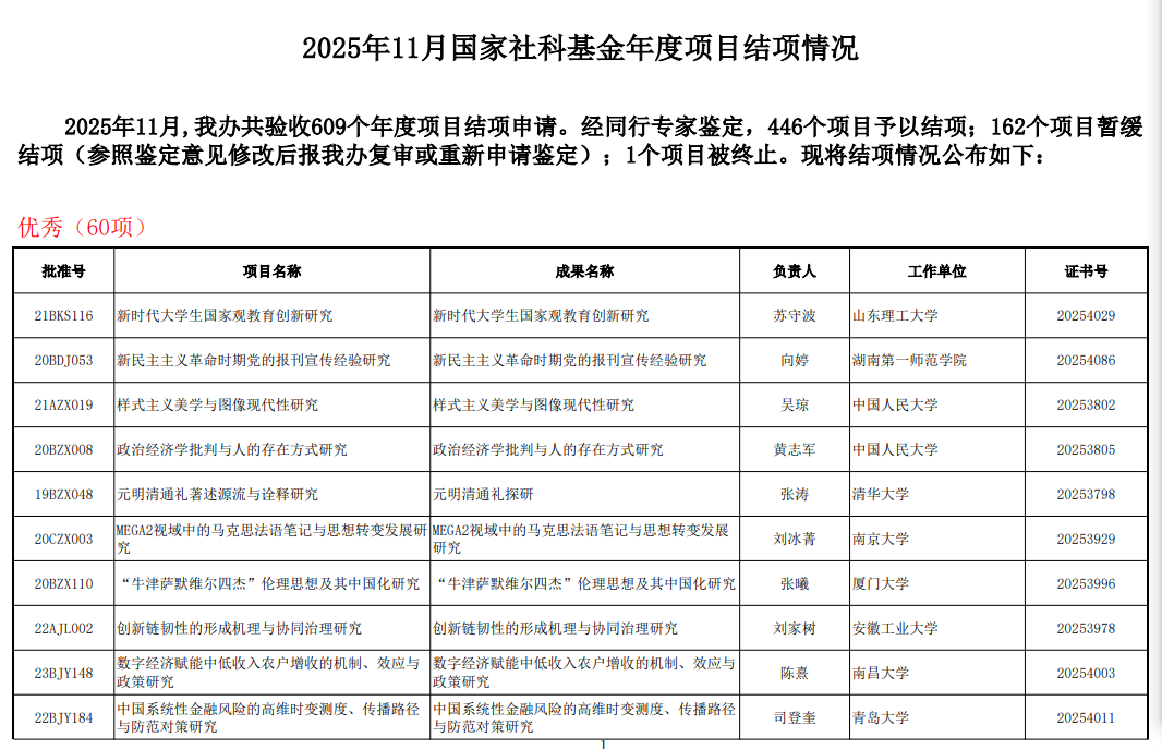 近日,全国哲学社会科学工作办公室公布了一批国家社会科学基金年度项目结项情况: