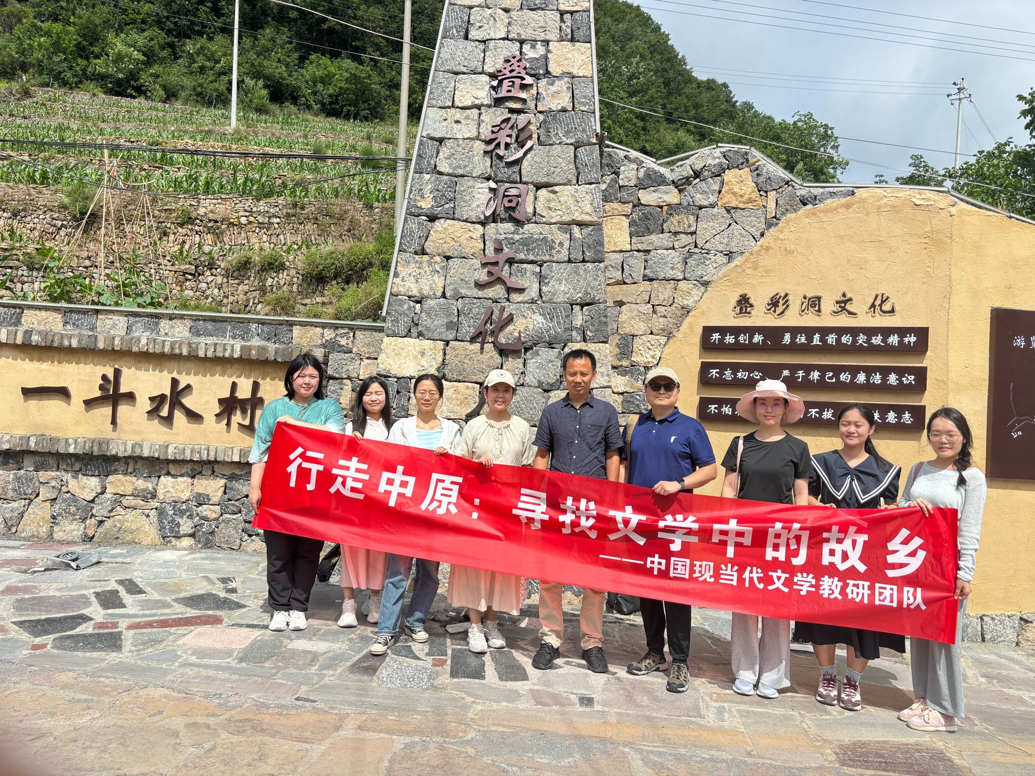 7月2日,郑州大学文学院中国现当代文学教研室、二月河文学艺术研究中心与文学教工党支部联合开展了“行走中原·寻找文学中的故乡”之一斗水村调研交流活动,本次活动由郑州大学文学院党委副书记、副院长,现当代文学专业学科带头人,二月河文学艺术研究中心主任李勇教授率队,师生一行十人赴焦作一斗水村、七贤镇等地实地深入调研。此次调研交流以“行走中原:寻找文学中的故乡”为主题,旨在以脚步丈量文学地理,激活古村落的文学文化记忆,探索文学研究与地域历史文化发掘的创新融合路径。