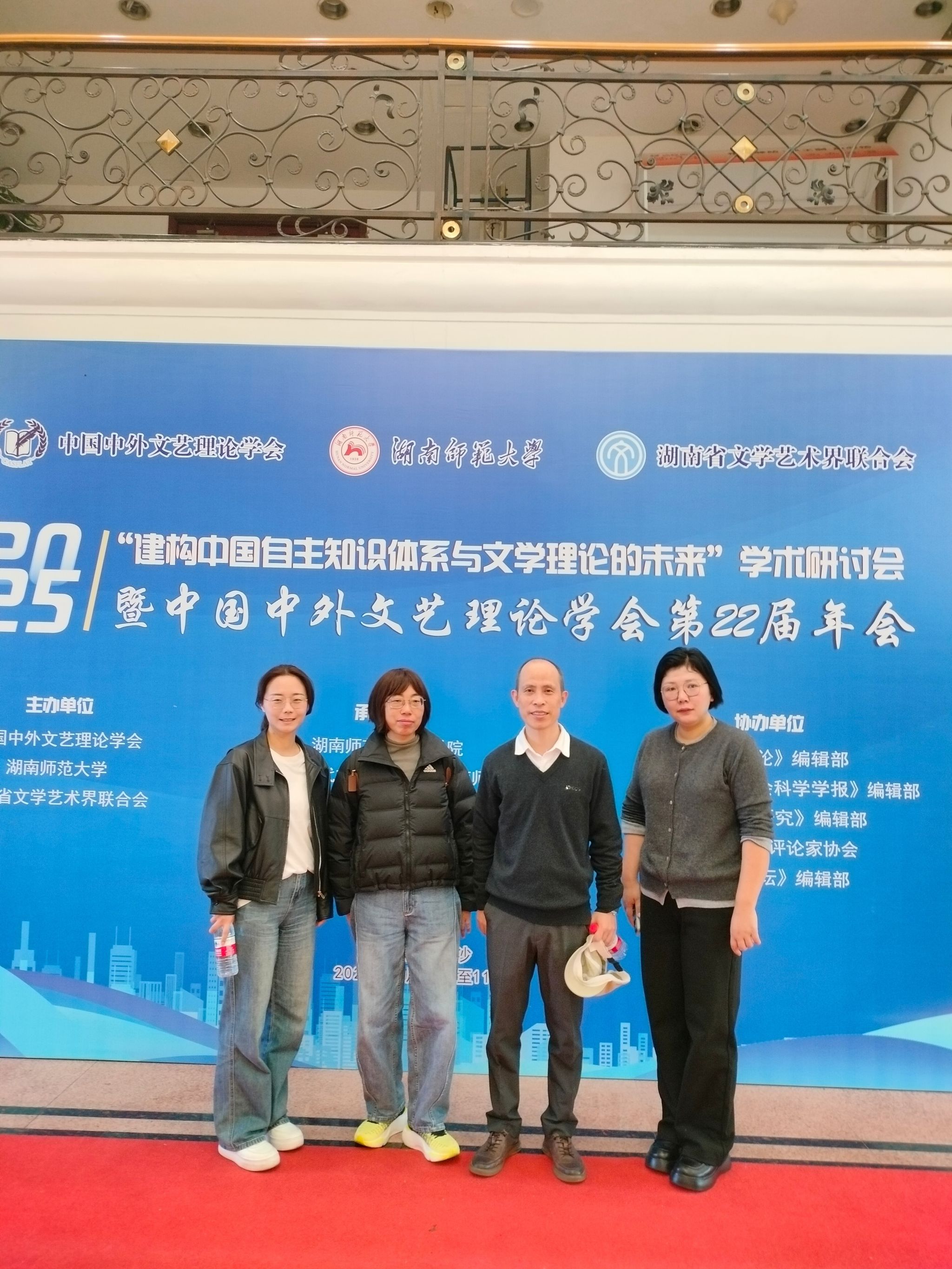 2025年10月31日至11月2日,由中国中外文艺理论学会、湖南师范大学、湖南省文学艺术界联合会主办的“建构中国自主知识体系与文学理论的未来”学术研讨会暨中国中外文艺理论学会第22届年会在湖南长沙举行。来自中国社会科学院、清华大学、浙江大学、南京大学等100余所高校及研究机构的300多位学者出席会议。我院贺玉高、梅启波、王进进、王欢欢、肖文婷五位老师应邀参加此次会议,并在大会上作出发言。