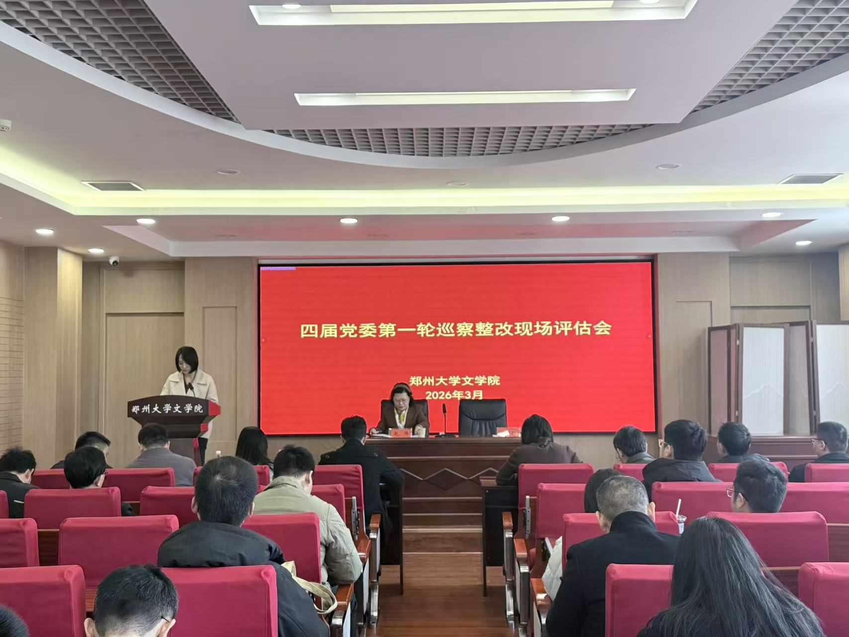2026年3月20日,四届党委第一轮巡察整改第二现场评估组到文学院开展巡察整改现场评估工作。评估组组长赵炜,成员郭喻楠、李兆坤、许明涛、刘烨,学院全体领导班子成员、师生代表等参加会议,会议由文学院党委书记云桓主持。