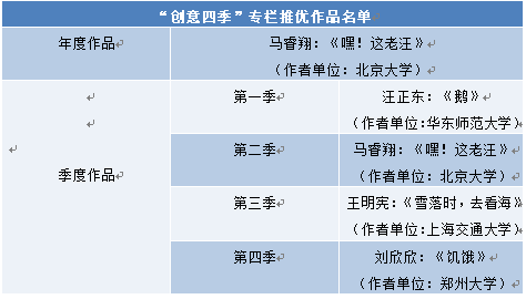 “创意四季”专栏是在河南省作家协会的支持下,由中国大学创意写作联盟与《中原文学》杂志联合举办,展示高校创意写作成果的一个栏目。作者来源包括联盟北京大学、清华大学、复旦大学等九所高校及其他几所开展创意写作教学的国内高校。专栏通过季度推优与年度推优相结合机制,为青年作者持续提供辅导、扶持与激励。在过去的一年,《中原文学》“创意四季”专栏连续刊载12期高质量稿件,内容涵盖乡村书写、城市生活、历史题材、科幻作品等多种类型,这些凝结着青年作家创意灵感、勤勉笔耕,专家学者教学启迪的优秀作品,共同组成了我国大学创意写作事业的蓬勃进行时。在这些青年作家的笔端,凝结着对人民的情感、对生命的敬畏、对文学的热爱,具有人文主义应有的永恒要素。经过评审专家严格公正的评审,我院刘欣欣同学的作品和来自北京大学、华东师范大学、上海交通大学的几位同学的作品被评为季度优秀作品,来自北京大学的马睿翔同学的作品《嘿!这老汪!》被评为年度优秀作品。