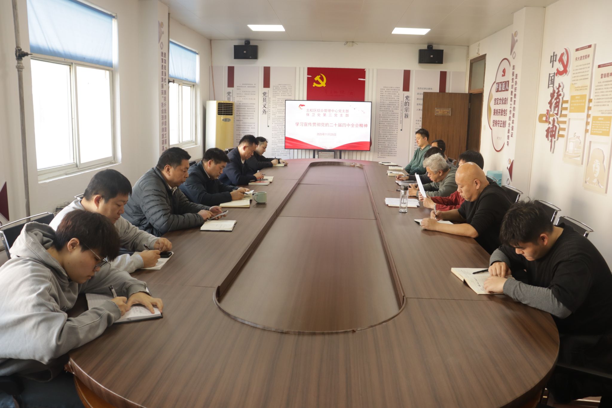 为深入学习贯彻党的二十届四中全会精神,推动全会部署与校园工作深度融合,11月25日,北校区综合管理中心党支部与保卫处第三党支部联合开展党的二十届四中全会精神专题学习活动,全体党员共同参与研讨。