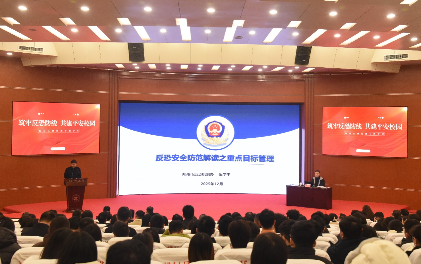 12月18日上午,我校在综合管理中心第一报告厅成功举办反恐怖宣传教育专题讲座。本次讲座由校党委宣传部、保卫处携手举办,特邀郑州市公安局反恐怖支队应急防范大队大队长伍学中作专题报告,主题为《筑牢反恐防线 共筑平安校园》。学校各职能部门负责人、各学院安全分管领导、辅导员及学生代表共计420余人参加。校党委宣传部部长孙保营、保卫处党总支书记郭文理在讲座开始前陪同徐东升副校长会见了讲座报告人。报告会由保卫处副...
