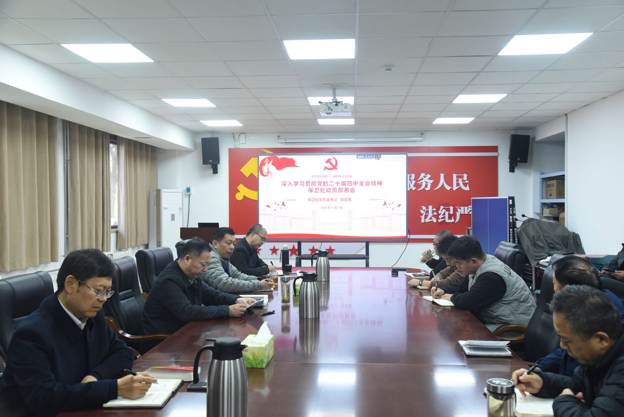 为全面贯彻落实党中央决策部署和省委、校党委工作要求,切实把思想和行动统一到党的二十届四中全会精神上来11月27日下午,保卫处召开深入学习贯彻党的二十届四中全会精神动员部署会。会议由保卫处党总支书记郭文理主持并领学,保卫处全体工作人员参加会议。