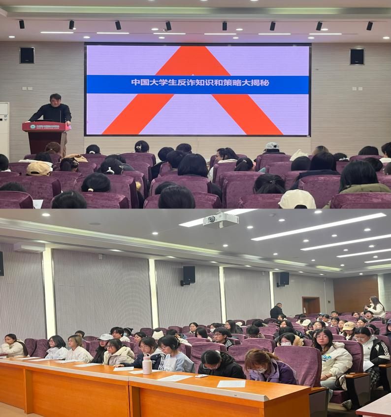 校警联动,反诈宣传精准送达。2025年12月8日,保卫处治安科特邀社区民警徐世军走进马克思主义学院,为师生带来了一场结合一线实战案例的专题讲座。徐警官以案说法,生动剖析了当前诈骗犯罪的新特点、新手法。12月10日,学校反诈工作站站长朱腾老师又应邀来到外国语与国际关系学院开展宣讲。朱老师以我校本年度发生的真实数据为切入点,揭示了校园诈骗案件覆盖面广、财产损失较大、在校生受骗概率较高的现实特点,强调了反诈教育的紧迫性与必要性。