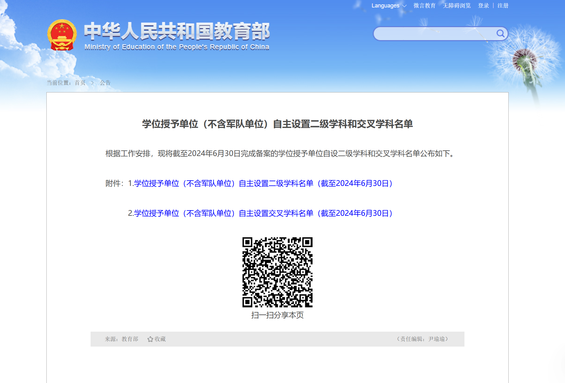 详见《教育部发布学位授予单位(不含军队单位)自主设置二级学科和交叉学科名单》http://www.moe.gov.cn/jyb_xxgk/s5743/s5744/A22/202410/t20241031_1160042.html