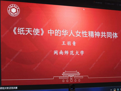 王羽青教授以“《纸天使》中的华人女性精神共同体”为题,围绕美国华语文学中的移民生存境遇,通过对文本细节的深入分析,考察华人女性之间的互动与精神联结,揭示了她们在逆境中构建共同体的内在逻辑与现实意义。他指出,这一精神共同体具有层次分明的支撑结构:善良与友爱是形成的基础,执着与忠诚是维系稳固的核心,乐观与坚强则构成其精神外延。这些品质不仅为华裔与其他族裔的融合提供了可能,也指向了构建多族裔互助共存的精神共同体的可行路径。评议人张建国教授对报告给予了高度评价,认为其选题集中、问题意识鲜明、论证脉络清晰。同时,他也建议未来可结合精神、物质等多重维度进一步考察共同体的建构过程,为研究开辟了更广阔的跨视角思考空间。