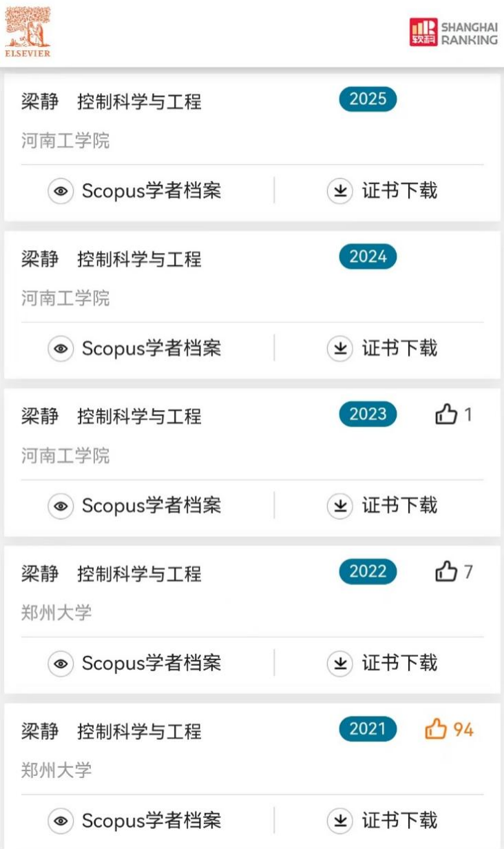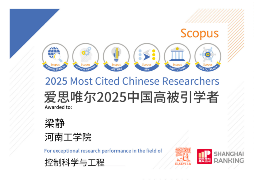 近日,爱思唯尔(Elsevier)正式发布 2025中国高被引学者(Highly Cited Chinese Researchers)榜单,郑州大学计算智能实验室负责人梁静教授连续第5年入选该榜单。截至目前,梁静教授在 Scopus 收录的学术成果总被引次数达16482次,引用其成果的文献数量超过11300篇。