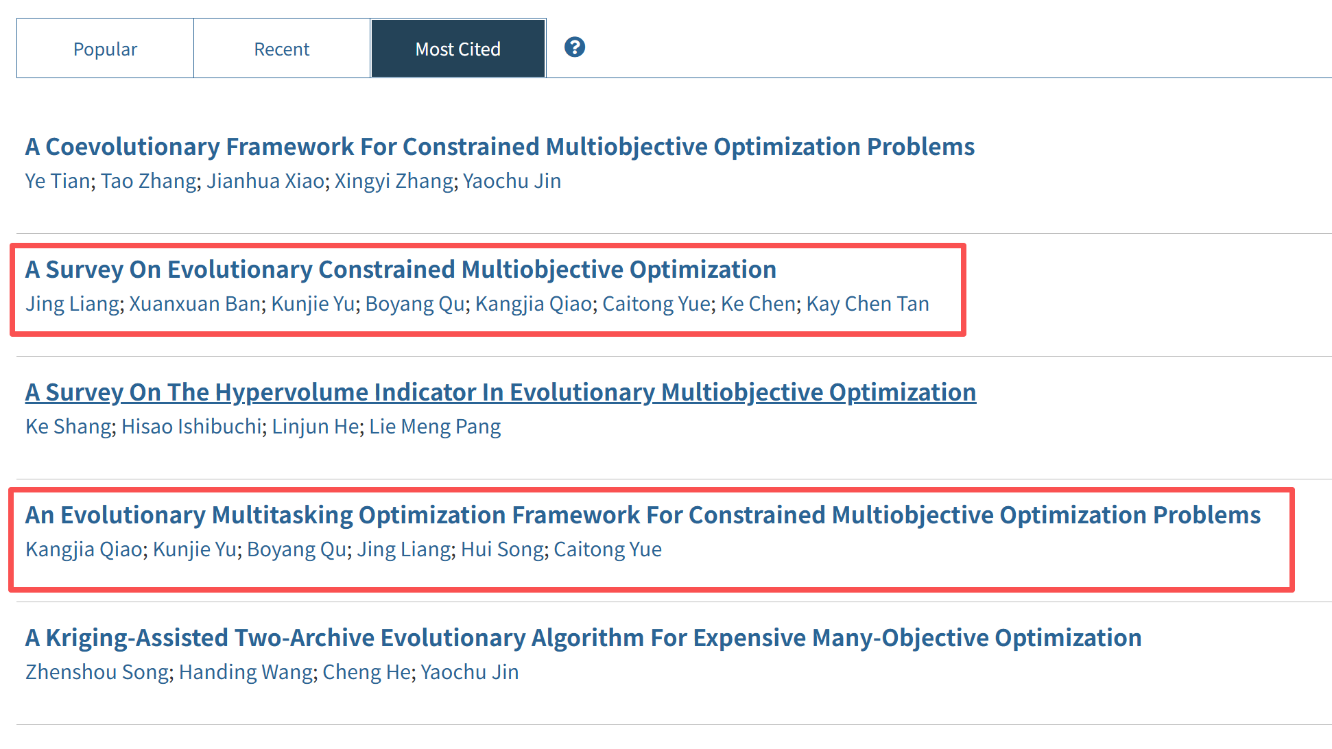近日,根据IEEE Xplore数据库实时显示,进化计算领域顶级期刊《IEEE Transactions on Evolutionary Computation》(IEEE TEVC)首页的Most Cited论文列表中,我课题组共有两篇论文上榜。两篇论文均为课题组在约束多目标优化方向的研究成果,充分彰显了课题组在约束多目标优化领域的研究实力与国际学术影响力。