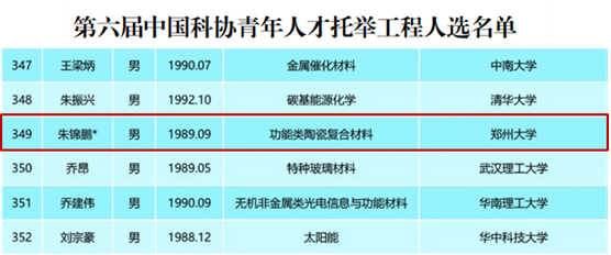 近日,中国科学技术协会发布《第六届中国科协青年人才托举工程人选名单公示》,来自绿色选冶与加工党支部的青年教师朱锦鹏副教授成功入选。该项目是由中国科协立项的国家级青年人才计划,择优支持有较大创新能力和发展潜力的32岁以下青年科技人才,帮助他们成长为国家主要科技领域高层次领军人才和高水平创新团队的重要后备力量。