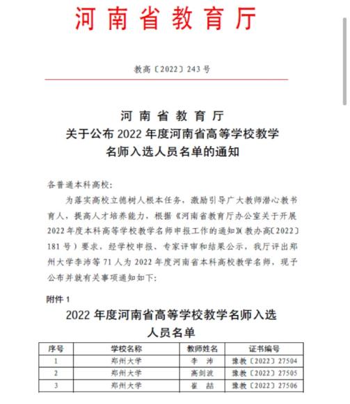 崔喆荣获2022年度河南省教育系统教学技能竞赛工科特等奖、“河南省高等学校教学名师”称号。