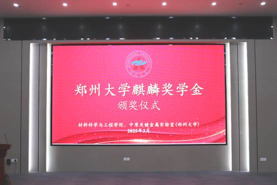 3月13日,郑州大学首届“麒麟奖学金”颁奖仪式在关键金属实验室C座报告厅举行。中国工程院院士、中原关键金属实验室主任何季麟,郑州大学党委常委、副校长胡少伟出席仪式并致辞。校友总会办公室主任、教育发展基金会理事长李苏贵,中原关键金属实验室(郑州大学)副主任赵红亮,校友总会办公室副主任、教育发展基金会副理事长兼秘书长陈颖,材料科学与工程学院党委副书记马睿、徐磊,全体获奖学生及部分师生代表参加仪式。仪式由材料科学与工程学院党委书记王瑞波主持。