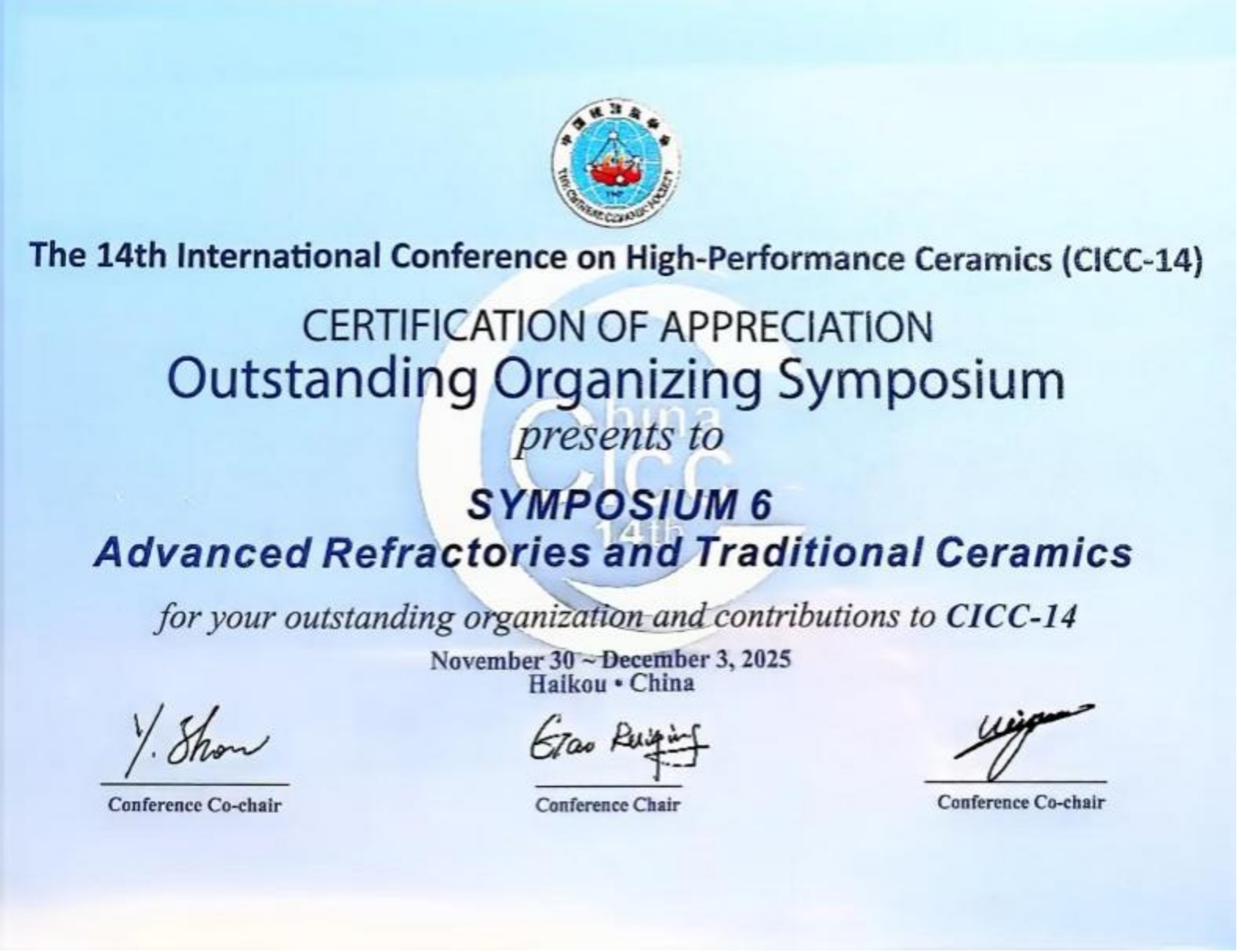 在本届大会组织中,王海龙院长受邀担任S6分会场“先进耐火材料与传统陶瓷”召集人、分会场主席并做主旨报告等;郑州大学科研院副院长邵刚教授担任S3分会场组织人;高温功能材料研究所所长刘新红教授协助组织S6分会场。在大会评选的“优秀组织奖”中,7个分会场获此殊荣,S6分会场成功入选,充分展示了我院在陶瓷与耐火材料领域的组织能力和学术影响力。