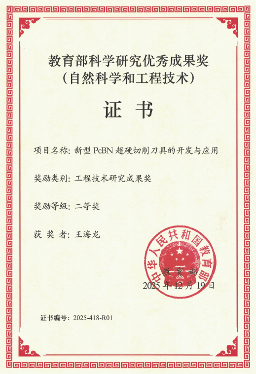 近日,2025年度教育部科学研究优秀成果奖(自然科学和工程技术)获奖名单公布,我院王海龙教授团队完成的“新型PcBN超硬切削刀具的开发与应用”项目,荣获工程技术研究成果奖二等奖。