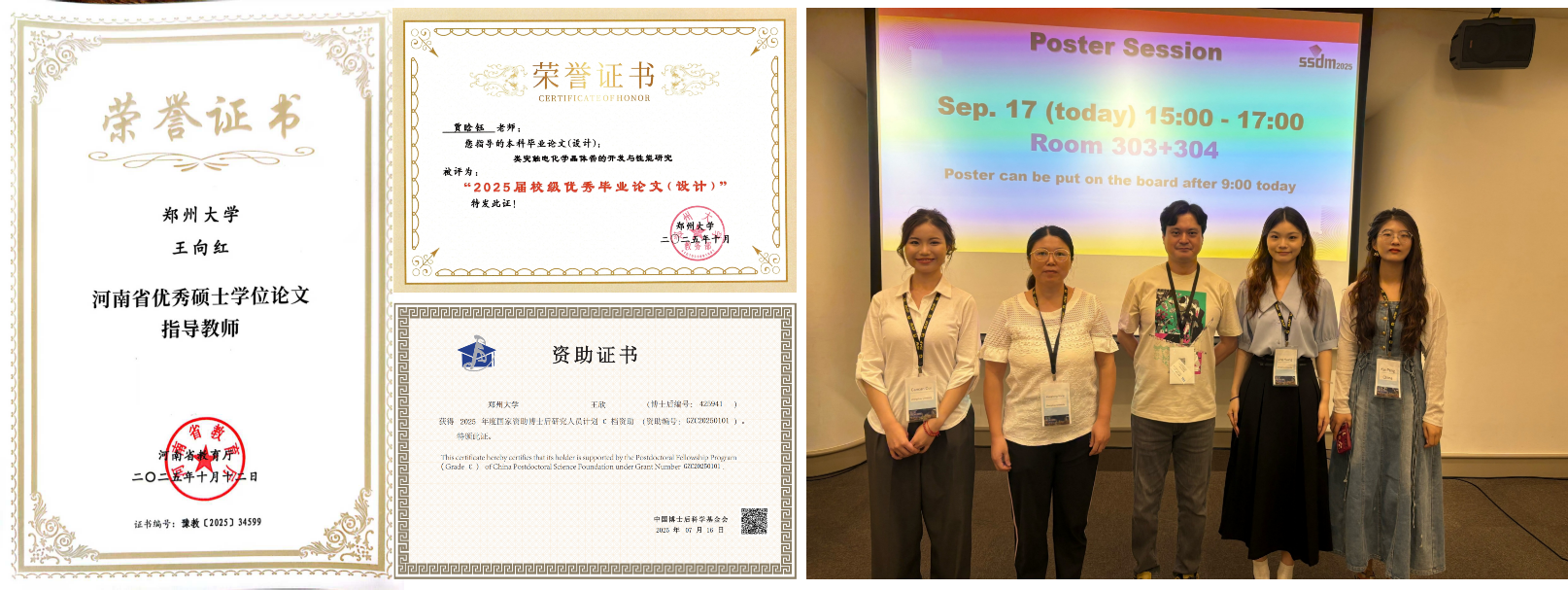 人才引育方面,形成结构合理、富有活力的团队:贾晗钰、杨会歌等人获多项校级荣誉;王向红被评为河南省优秀硕士论文指导教师;新引进高层次人才2人,尚跃群获评正高级青年研究员,王欣获国家博士后C档资助;职称晋升1人。
