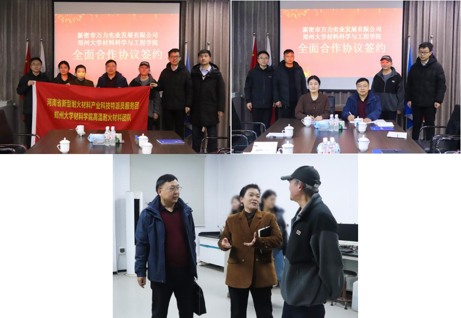 随后,服务团一行前往新密市万力实业发展有限公司,此行的重点是洽谈对接前期调研结果,推动合作迈入战略新阶段。围绕固废资源化高值利用、产品性能提升技术及新产品联合开发等核心议题,校双方进行了深度商谈。基于对共同愿景的高度认同,河南省新型耐火材料产业科技特派员服务团与万力实业现场签署了战略合作协议。协议不仅规划了具体的技术攻关项目,更明确了共建研发平台、共享实验资源、共育专业人才的机制。这标志着双方关系迈向了以创新链深度融合为导向的、体系化的战略伙伴关系,这正是“环郑大科创圈”所倡导的构建长期稳定协同创新格局的体现。