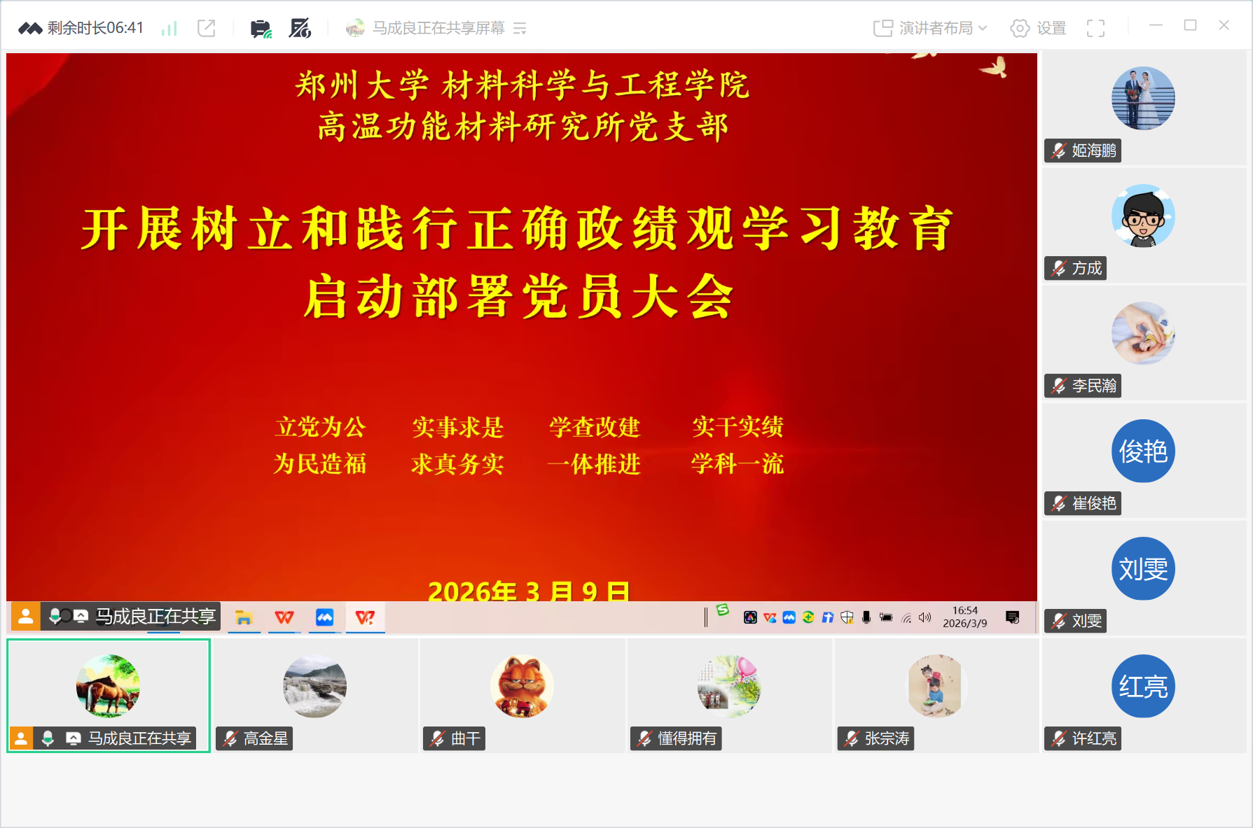 为深入学习贯彻习近平总书记关于树立和践行正确政绩观学习教育的重要讲话和重要指示精神,全面落实学院党委工作部署,近日,高温功能材料研究所党支部召开党员大会,正式启动树立和践行正确政绩观学习教育并作出全面部署。全体党员通过网络会议参加会议,会议由支部书记马成良主持。