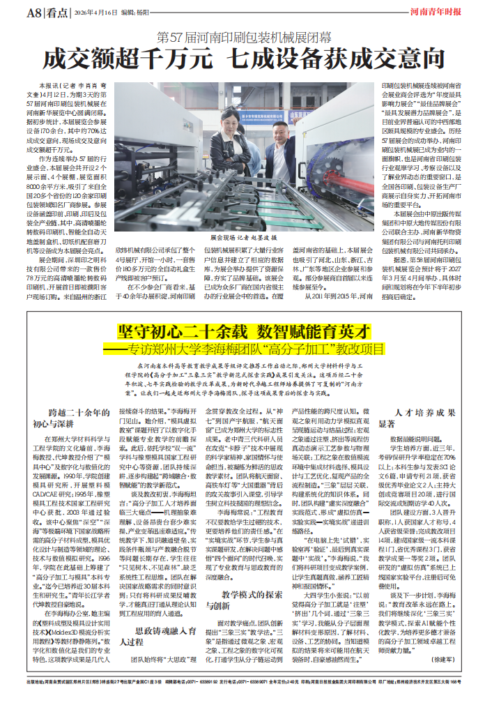 近日,河南省级媒体《河南青年时报》以《坚守初心二十余载 数智赋能育英才》为题,对学院李海梅教授教改项目团队历时二十余年探索实践的《高分子加工“三象三实”教学新范式》成果进行了深度报道。该报道充分肯定了这项教改成果为新时代卓越工程师培养提供的“河南方案”。