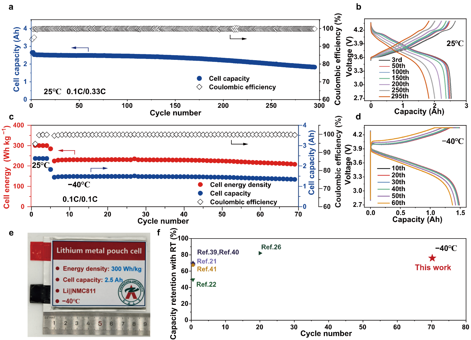 随着智能电子设备在高纬度和高海拔地区的广泛应用,商用锂离子电池在零下40℃的极端低温环境中面临容量急剧下降甚至失效的问题。锂金属电池因其负极离子传输路径较短和独特的沉积/剥离机制,被视为低温应用的潜在解决方案,但高能量密度软包电池在低温下的电解液设计与界面稳定性仍是实现其稳定循环的核心挑战。针对这一挑战,牛朝江团队提出一种“强溶剂(DME)+弱溶剂(DMC)”竞争配位策略。通过DMC破坏Li⁺与DME之间的强相互作用,诱导局部无序溶剂化结构的产生,降低Li⁺的去溶剂化能垒。同时诱导了富含无机物的电极/电解液界面层的形成,有效抑制了锂枝晶的生长,加快了界面传输动力学。结果表明,300 Wh/kg软包电池在零下40℃下可输出77%的能量,循环70次后容量保持率为93%,显著优于现有报道成果。相关成果以“Competitive Coordination Effect to Simultaneously Achieve High Energy and Stable Cycles in Li-Metal Pouch Cell under -40℃”为题发表在《Energy & Environmental Science》上。郑州大学材料科学与工程学院为第一单位,孟星星硕士为第一作者,牛朝江教授和张枭副研究员为共同通讯作者。文章链接:https://doi.org/10.1039/D5EE03522H。