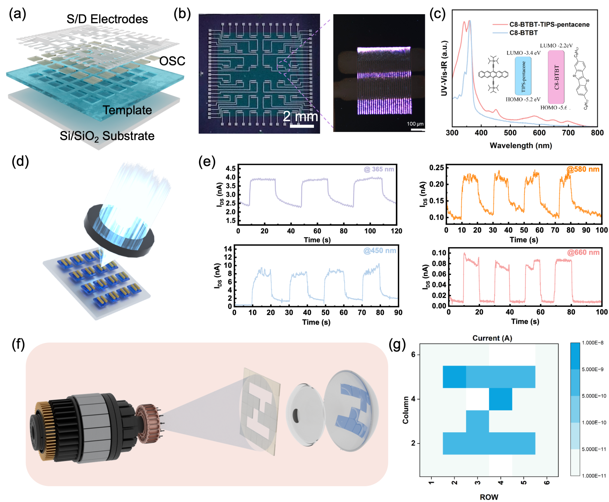 在此基础上,团队进一步构建多组分半导体阵列,实现400–650 nm宽光谱响应,并通过仿生视网膜结构设计完成图像识别演示,将光学信息直接转化为二维电流分布,成功实现字母图形识别,展示出在神经形态视觉感知与智能传感系统中的应用潜力。