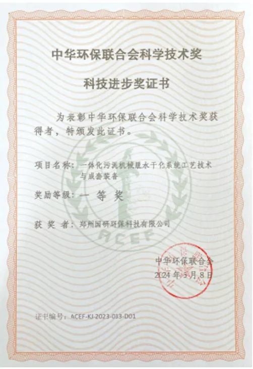 重点孵化企业国研环保获得中华环保联合会科学技术奖科技进步奖一等奖