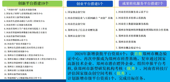 累计建有国家、省、市级创新平台31个,其中创新平台19个、创业平台5个、成果转化平台7个。主要有科技部“电子材料与系统国际联合研究中心”、“科创中国”先进技术创新基地、石油和化工行业“高性能尼龙工程塑料工程实验室”、河南省“智能网络和数据分析国际联合实验室”、“国家级众创空间”、“河南省重大新型研发机构”、“河南省制造业与互联网融合双创基地”、“郑州市先进移动通信及行业应用重点实验室”等。