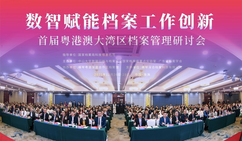 2025年11月26-28日,首届粤港澳大湾区档案管理研讨会在珠海举行。研讨会以“数智赋能档案工作创新”为主题,在国家档案局科技信息化司的指导下,由广东省档案学会和中山大学数据归档与档案安全国家档案局重点实验室(以下简称实验室)共同主办,横琴粤澳深度合作区档案馆协办。与会人员包括广东省档案局、广东省档案馆,全省21个地级市档案局、档案馆代表,港澳特别行政区档案机构负责人,以及来自其他省市档案领域的领导、专家学者、实务工作者及档案服务企业代表,近300人齐聚一堂,共同就数智技术推动档案工作创新展开深入研讨。郑州大学档案与校史馆副馆长伏琰带领相关科室人员参会。
