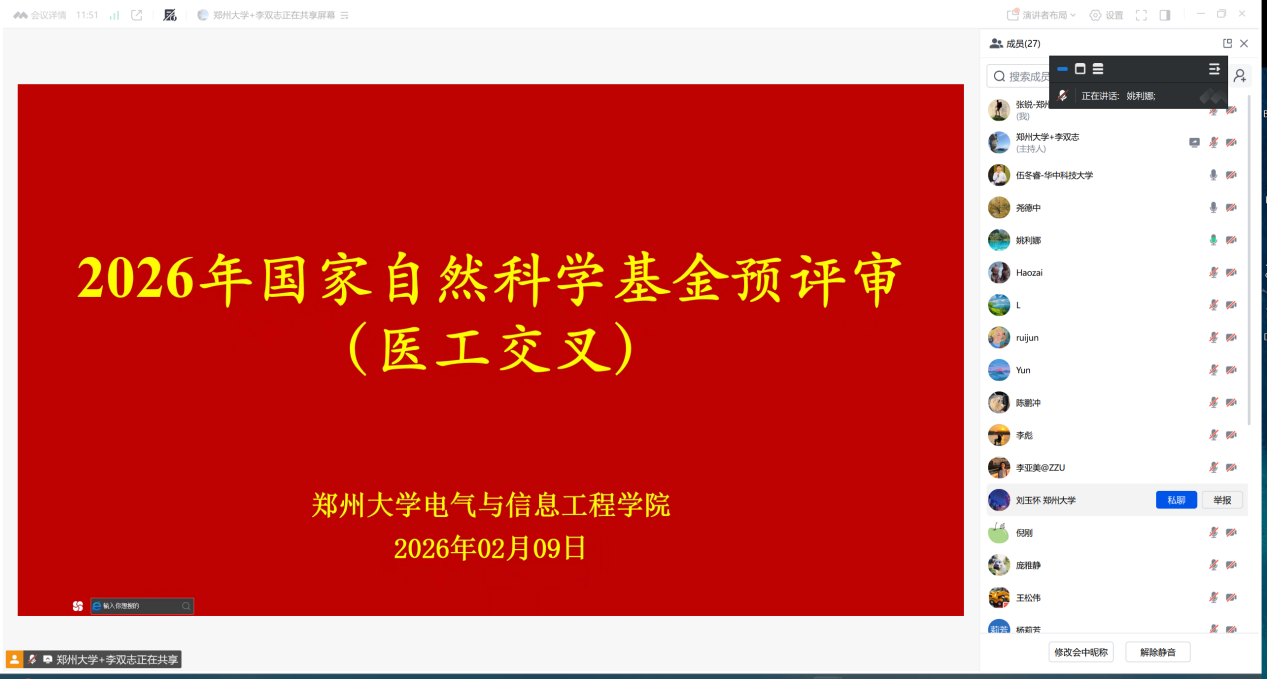 2026年2月9日下午14:00-17:30,应我院副院长姚利娜教授邀请,电子科技大学尧德中教授、华中科技大学伍冬睿教授通过腾讯会议,为我院医工交叉研究方向老师进行2026年国基金申请书预评审。预评审会议由副院长姚利娜教授组织,学院30余名教师在线上参加了会议。