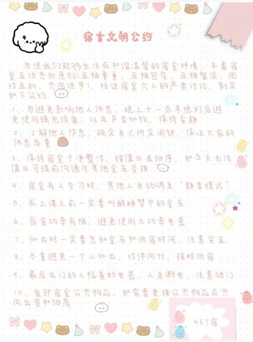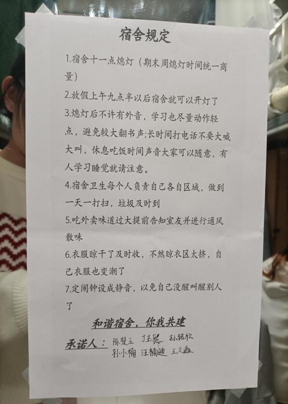 围绕作息管理、卫生维护、安全用电、人际相处等核心内容,各宿舍通过全员讨论、民主协商的方式,制定了个性化《宿舍文明公约》。公约内容贴合宿舍实际,既包含“按时作息,不影响他人休息”“轮流值日,保持宿舍整洁”等基础要求,也有结合宿舍成员特点制定的个性化条款,如“共同学习,每周开展一次宿舍读书分享会”“合理使用电子设备,避免沉迷游戏”等。