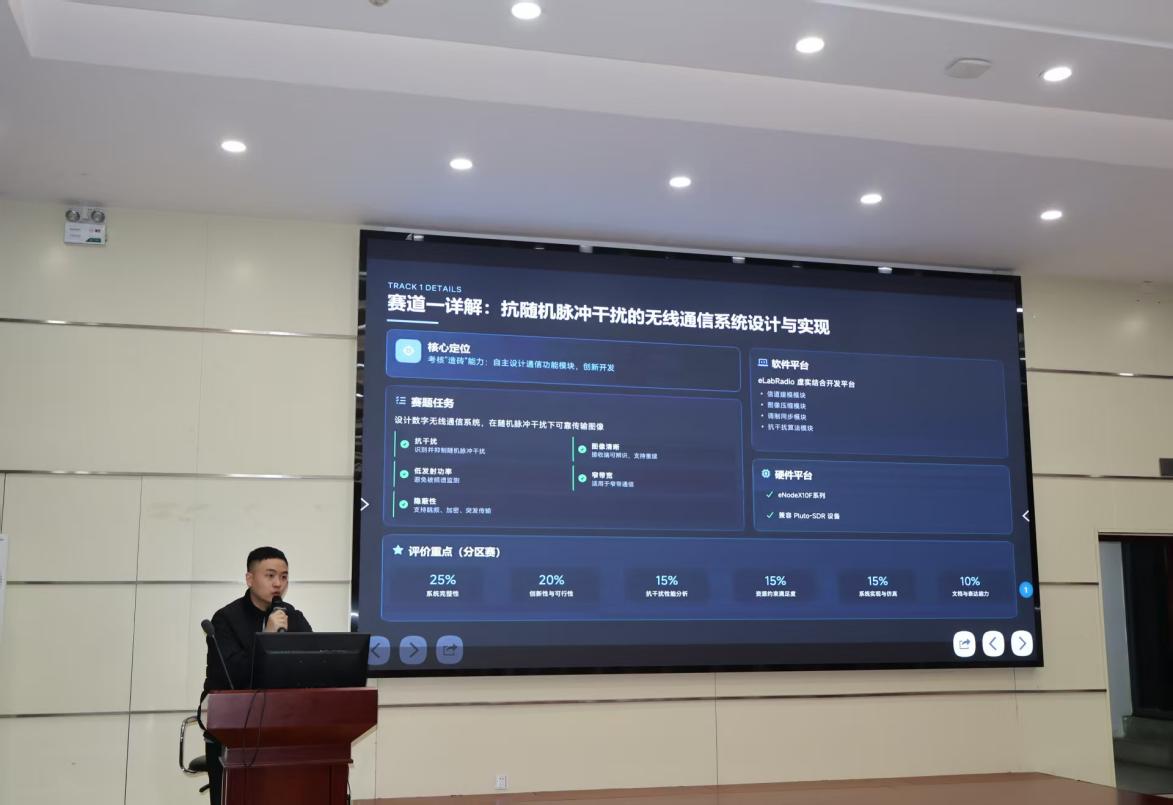 活动现场,王威工程师围绕两项赛事作专题解读。针对“大唐杯”,他重点介绍了赛事以培育新质生产力人才为目标、实行多赛道并行的竞赛模式,并成功入选全国普通高校大学生竞赛白名单的基本定位与赛事优势;对于“凌特杯”,他详细阐述了赛事坚持公益办学理念、实行参赛费用全免、深度对接高校课程体系建设的鲜明特点。
