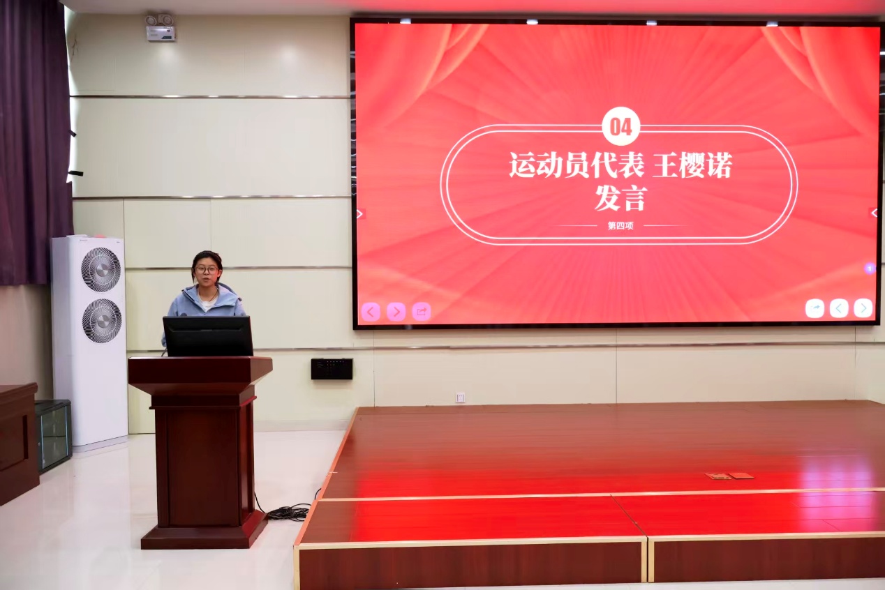 运动员代表王樱诺分享参赛感悟。秦毅男书记在总结讲话中,充分肯定了本届校运会成绩,勉励师生保持昂扬向上的精神风貌,并提出四点希望:坚定理想信念、勇于拼搏进取、强化团结协作、坚持全面发展。