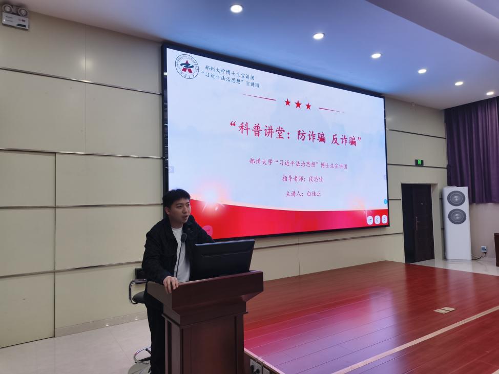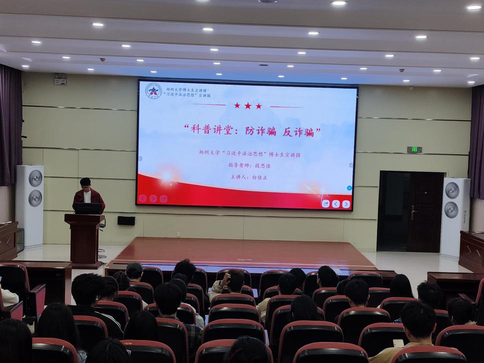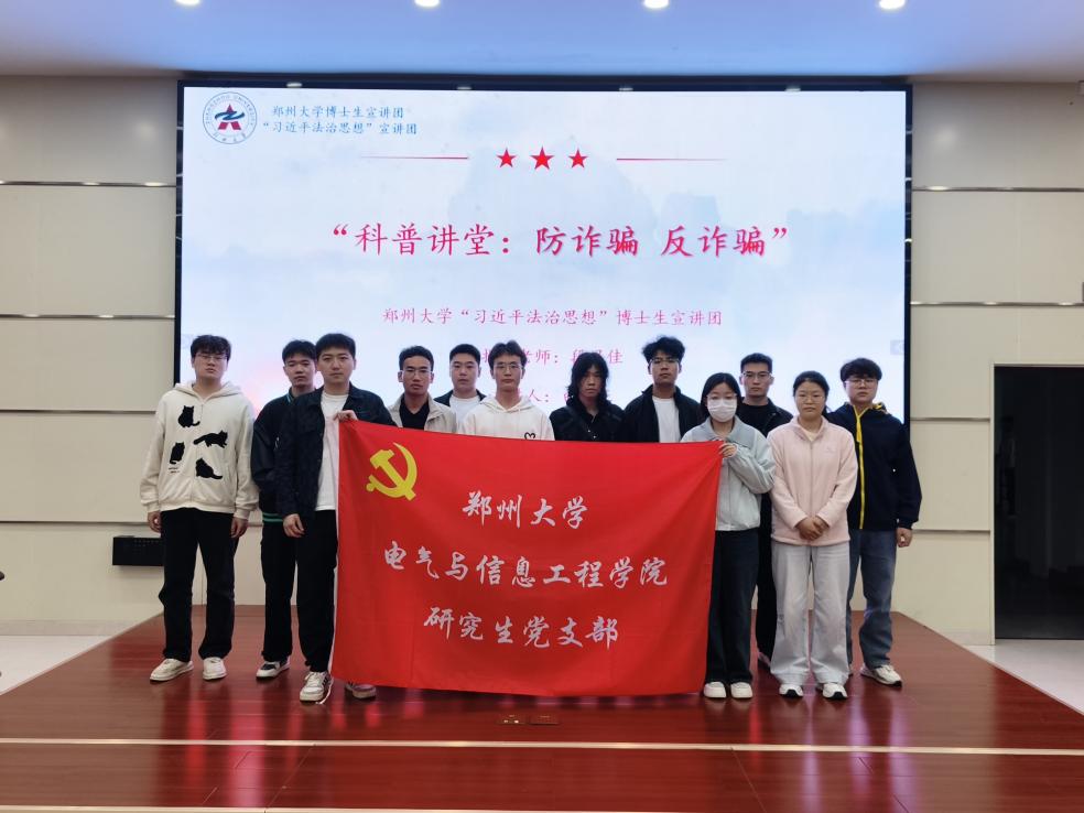 为深入学习贯彻习近平法治思想,切实提升青年学子法治意识与安全防范能力,筑牢校园反诈安全防线,2026年4月9日19:00,郑州大学电气与信息工程学院于学院五楼报告厅成功举办“科普讲堂:防诈骗,反诈骗”专题宣讲会。本次宣讲特邀郑州大学博士生宣讲团——“习近平法治思想”分团讲师白佳正主讲,学院各研究生党支部党员、入党积极分子线下参会学习。