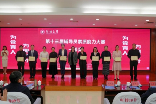 在郑州大学第十三届辅导员素质能力大赛(训练营)中,学院荣获“优秀组织奖”,四位专职辅导员李帅辉、闫冬、杨笑菡、王思宇全员晋级复赛,荣获一等奖1项、二等奖3项;杨笑菡获批郑州大学培育性辅导员工作室立项;李帅辉、王思宇分获郑州大学第二十一届学生思想政治工作理论研讨会优秀论文二等奖;李帅辉、杨笑菡分获郑州大学辅导员优秀工作案例一等奖。