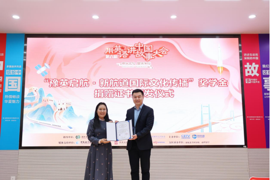 河南新航道出国留学服务有限公司向我院捐赠20万元设立专项奖学金,主要用于支持学院开展“用英语讲中国故事大会”系列活动、资助师生赴国内外实习实训与研修等,助力学院人才培养与国际文化传播工作。仪式上,丁忠华代表学校接受捐赠,高晓玲向孙万年颁发捐赠证书,标志着该奖学金项目正式启动。