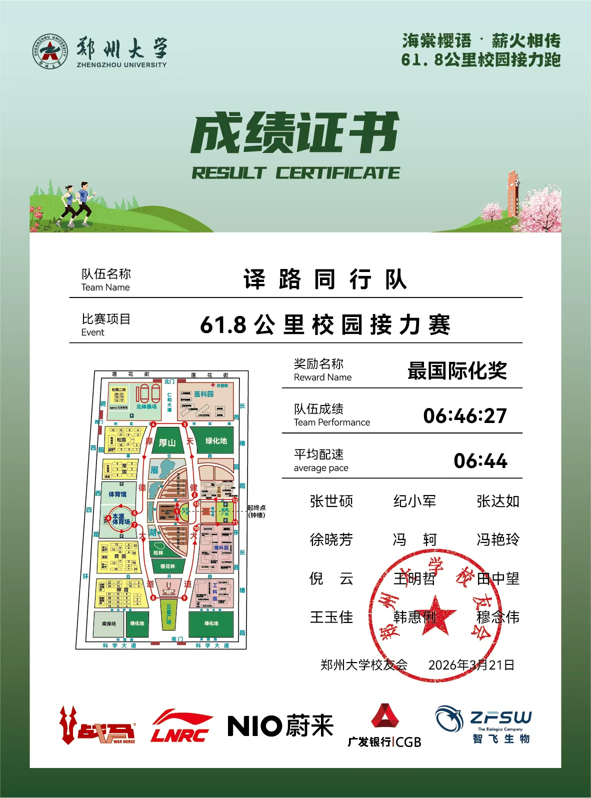 春和景明,逐梦前行。2026年3月21日,由我院12名中外籍师生、校友组成的“译路同行”代表队,参加了郑州大学校友会精心策划的“海棠樱语·薪火相传”61.8公里校园接力跑活动。队员们以语言为桥、脚步为笔,在郑大校园书写属于外语人的热血篇章,致敬青春岁月,凝聚奋进力量。