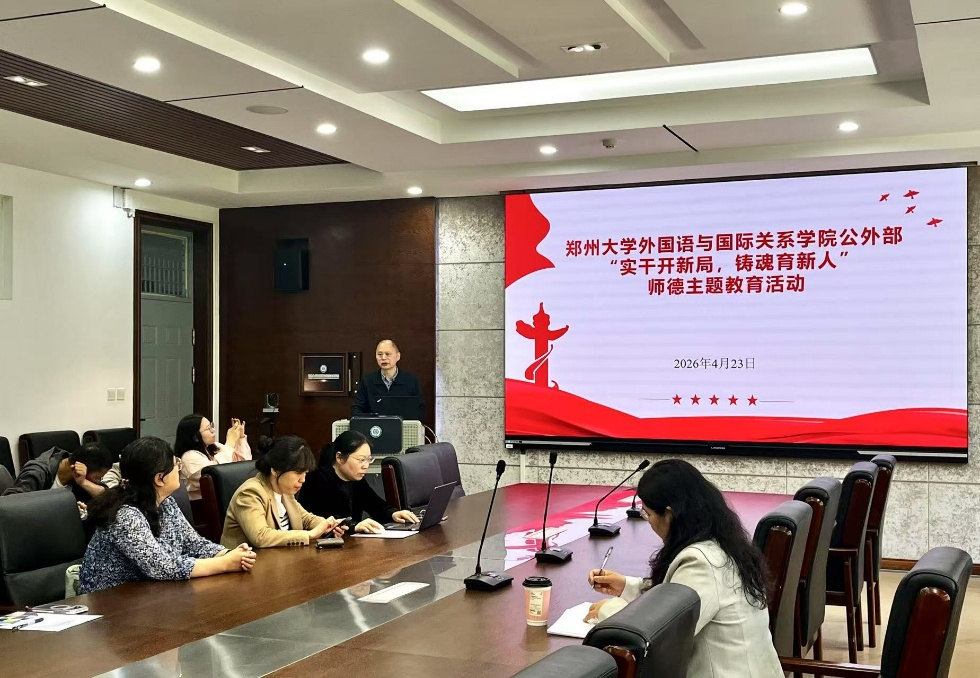 为全面加强新时代教师队伍建设,弘扬高尚师德师风,4月23日,郑州大学外国语与国际关系学院公共外语部教工党支部组织开展“实干开新局,铸魂育新人”师德主题教育活动。学院副院长张莉出席指导,公共外语部教工党支部书记胡光全领学,全体党员教师参加活动。