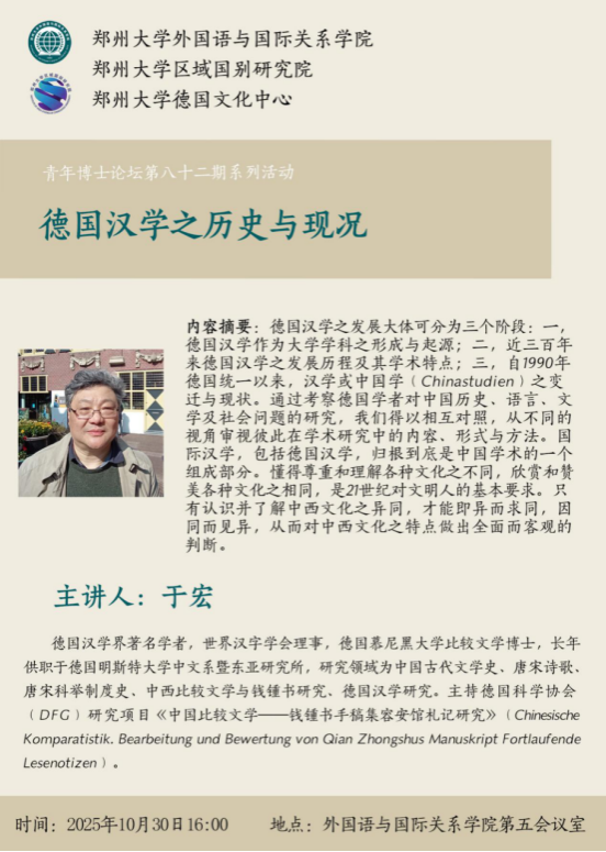 为了促进郑州大学师生与国内外知名专家学者之间的学术交流与合作,推动郑州大学外国语与国际关系学院、郑州大学区域国别研究院和德国文化中心的建设与发展,开阔我院教师及研究生的学术视野,特别邀请德国明斯特大学于宏老师来我院举办学术讲座。欢迎全校广大师生积极参加!