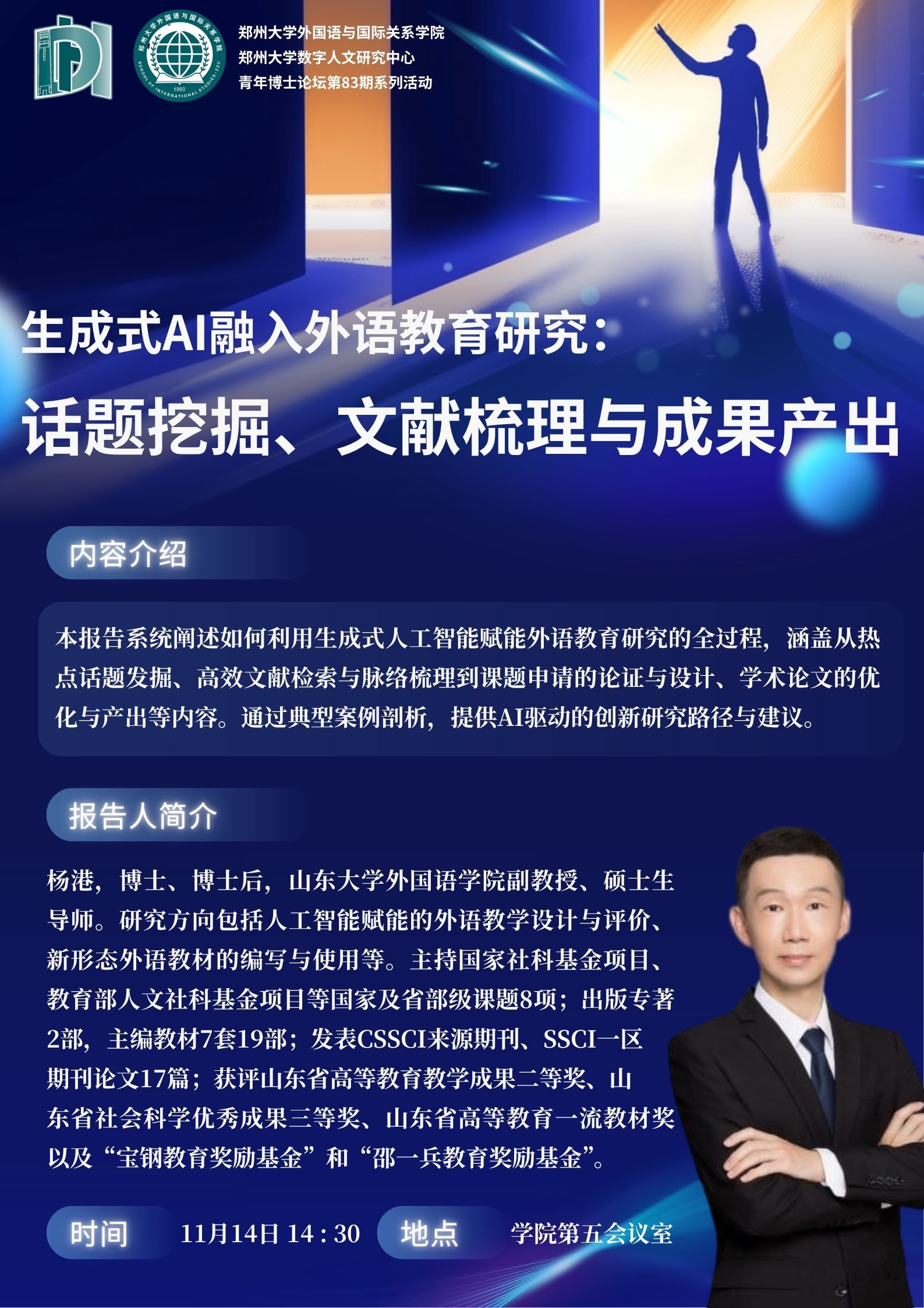 讲座题目:生成式AI融入外语教育研究:话题挖掘、文献梳理与成果产出