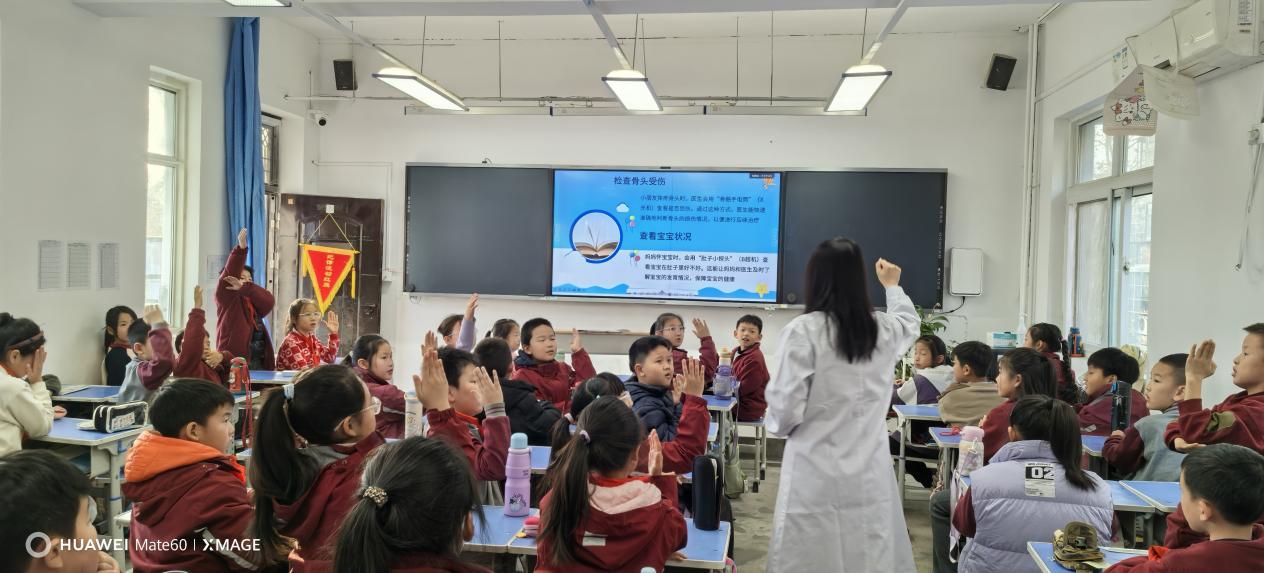 课堂高潮出现在“影像小侦探”游戏环节。肖医生展示简化版骨骼正常图、轻微骨裂图和健康内脏B超图,引导学生寻找差异。“哪张图里的骨头有小裂纹?”孩子们瞪大双眼认真观察,踊跃抢答,答对者获得PPT动画贴纸奖励,在趣味闯关中掌握实用知识。活动尾声,她用三句口诀总结:“身体照相机本领大,帮医生找小问题;检查时听医生话,照片清晰无偏差;爱护身体少生病,健康成长乐哈哈”,助力知识记忆。