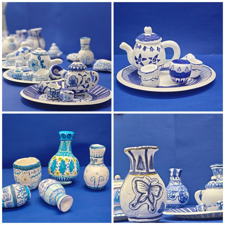 课堂上,孩子们的创造力被彻底点燃。有的专注复刻经典缠枝莲纹样,白色粘土在指尖巧妙交织,蓝色马克笔勾勒出古朴典雅的线条;有的大胆发挥想象,把卷草纹、几何图案和花朵元素“揉”进了青花装饰里,让柔美的曲线、规整的纹样“铺”在瓶身,传统蓝白调瞬间变得鲜活灵动;有的则跳出“瓶罐”的常规造型,把粘土捏成带把手的小执壶、能摆能拿的迷你摆件,赋予传统工艺全新的实用价值。一双双稚嫩的小手时而揉捏、时而按压、时而雕琢,原本普通的粘土在孩子们的巧思下,渐渐变成一件件稚朴可爱、蓝白相间的立体作品。