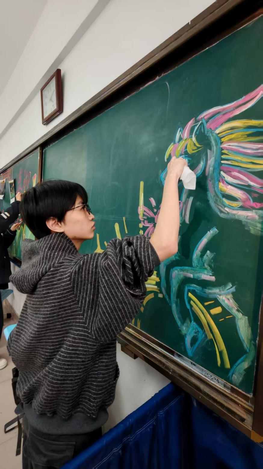 彩色的粉笔在手中流转,灵动的图案在黑板上成型。同学专注地绘制着元旦主题的创意插画,线条与色彩的碰撞,让原本单调的黑板变得鲜活起来。大胆的创意、独特的设计,尽显九一班少年的想象力与创造力。