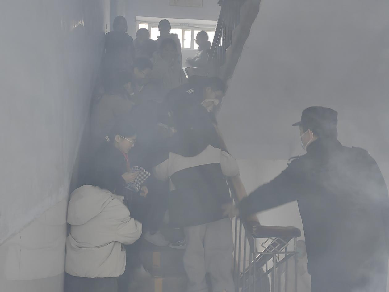 第二节课后,演练正式启动。保安在教学楼东、西两侧楼梯口点燃艾叶和松针,瞬间浓烟滚滚,模拟出高层火灾中浓烟弥漫的逼真场景,营造出沉浸式应急氛围。紧接着,校园广播响起紧急疏散信号,告知全体师生发生火灾需紧急撤离。