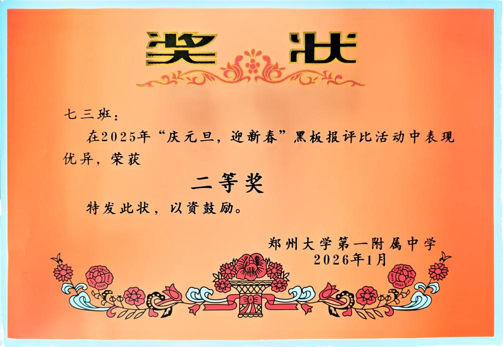 一块黑板,绘出了元旦的热闹与新春的期盼;一个月的付出,见证了两个女孩的真挚友谊,更凝聚了整个班级的同心协力。这份二等奖,是对所有同学的肯定,更是七三班团结风采的最好见证!新的一年,愿七三班的孩子们继续带着这份热忱与默契,在成长路上并肩前行,收获更多精彩!