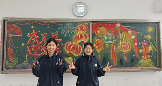 这份荣誉的背后,藏着两个女孩一个月的坚守,更藏着整个班级拧成一股绳的温暖。接到板报任务时,班里的小婷和小晴二话不说扛起了主力大旗。从元旦的喜庆元素构思,到新春的吉祥符号挑选;从版面的整体布局规划,到字体的大小间距调整,这两个小姑娘前前后后忙活了整整一个月。课间的黑板前总有她们的身影,要么蹲在地上勾勒轮廓,要么踮着脚尖填充色彩,手上沾了粉笔灰也不在意,额头渗了汗珠子就随手擦一把。遇到拿不准的设计细节,两人就凑在一起小声商量,你提建议我来改,默契得像一对小搭档。
