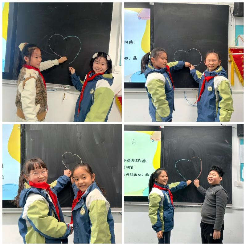 “不许说话,听指令同步行动!”随着老师一声指令,趣味默契挑战正式开启。同学们两人一组,闭眼面对面站立,双手握粉笔在同一起点同步画心,全程无言语沟通,全凭彼此的默契配合落笔。有的小组步调契合,画出的爱心圆润对称,尽显心意相通;有的小组画风“跑偏”,线条交错引得全场捧腹。睁眼看到作品的瞬间,教室里满是惊喜欢呼与相视大笑。这场充满童趣的热身游戏,不仅快速活跃了课堂氛围,更让孩子们直观体会到:默契,是串联友谊最闪亮的纽带。