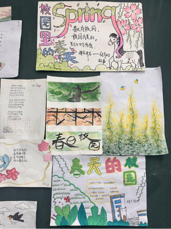 从“春日校园”的手抄报,到满是细节的风景画,每一幅作品都藏着同学们对校园的观察:粉的花、绿的草、蓝的天,还有阳光下闪烁的少年目光,都是他们眼里最美的春景。