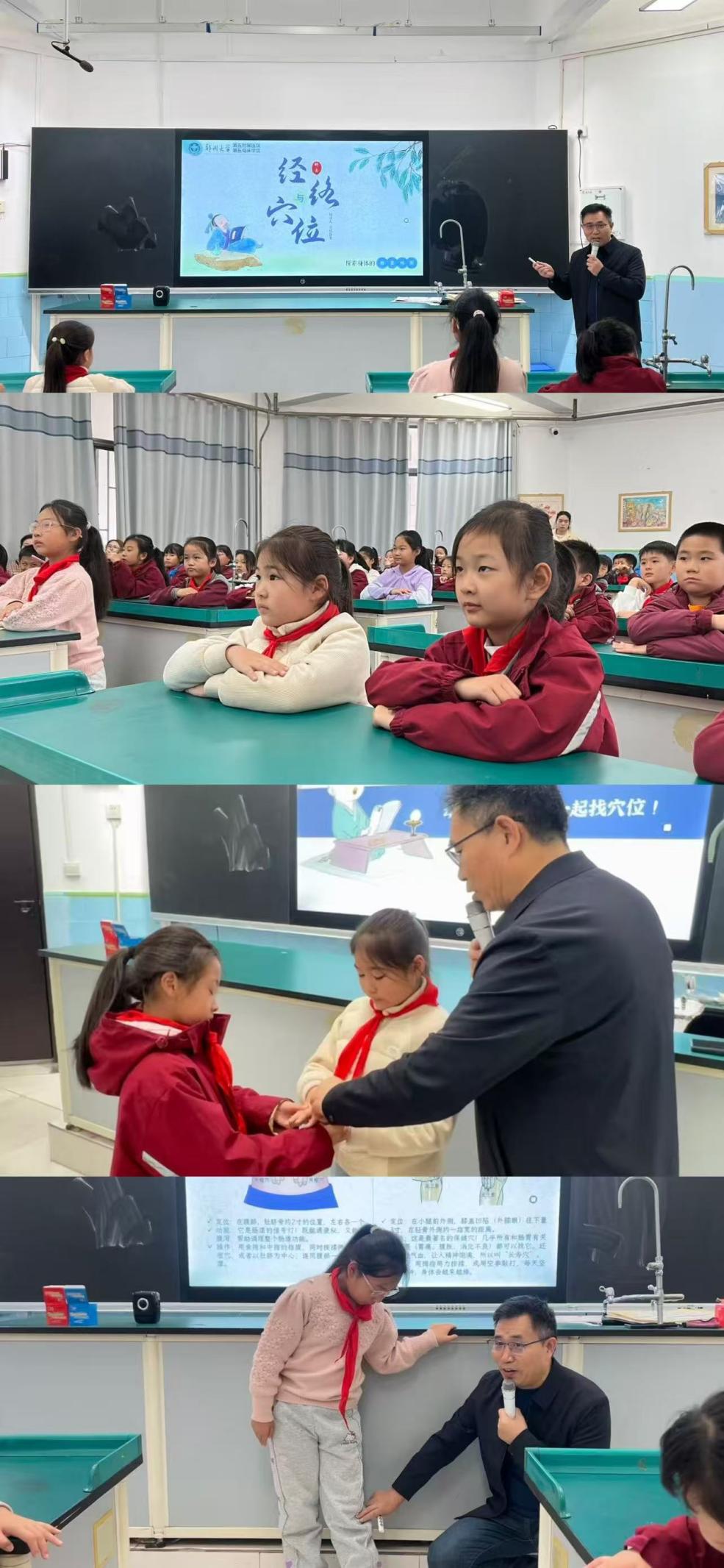 最让孩子们兴奋的是“动手找穴位”环节。徐辉医生教大家用“手指度量法”:“把拇指竖起来,指关节的宽度就是1寸,这是我们自己的‘小尺子’!”他带着孩子们一步步找穴位:在鼻子两旁找到能通鼻塞的“迎香穴”,在手背上找到能缓解牙疼的“合谷穴”,还教大家用四指并拢量出3寸,找到膝盖下方的“足三里”——“这是‘长寿穴’,每天给爷爷奶奶按5分钟,他们会更有精神哦!”孩子们两两一组,互相在对方手上、脸上比划,时不时举手问“医生叔叔,我按这里酸酸的,对吗?”,课堂氛围热闹又温馨。